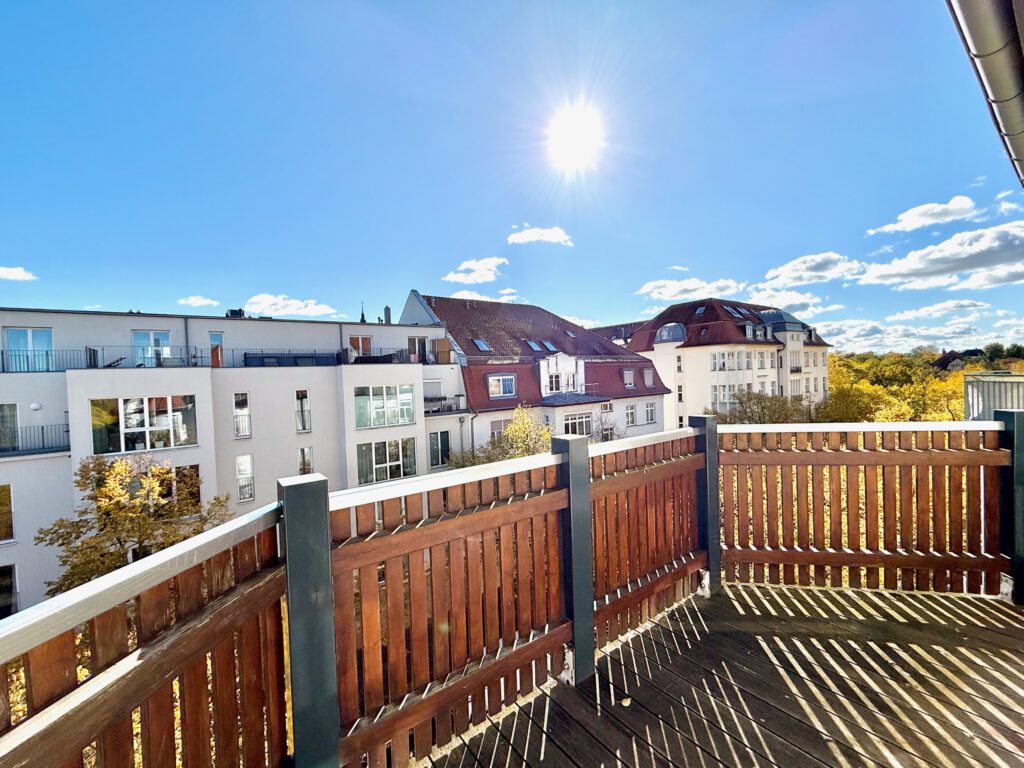 Zwei gemütliche Dachterrassen, eine davon mit freiem Blick über den Clarapark, vier Zimmer verteilt auf zwei Ebenen und ca. 162 qm Wohnfläche, eine moderne, weiße Einbauküche mit Küchenblock, ein Holz-Kamin, ein großer Wohnraum mit Panoramafenstern und das alles aus dem Jahr 2004 (auf einen Altbau aufgesetzt).